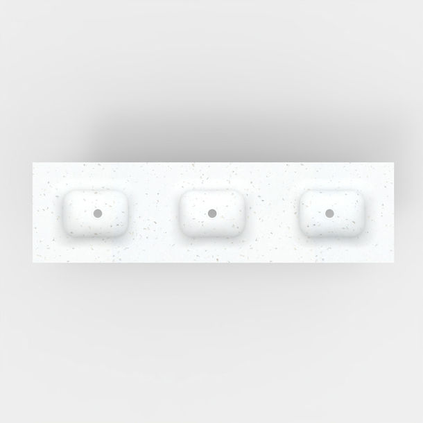 Plan vasque triple moulé en SoftSurface™, Le Pavé®, composé de plastique 100% recyclé. Il est adapté aux lieux public et répond aux normes PMR pour s'intégrer dans de nombreux univers, en couleur légèrement terrazzo blanc, minérale, ou floréal, il saura mettre en valeur vos espaces sanitaires collectifs.